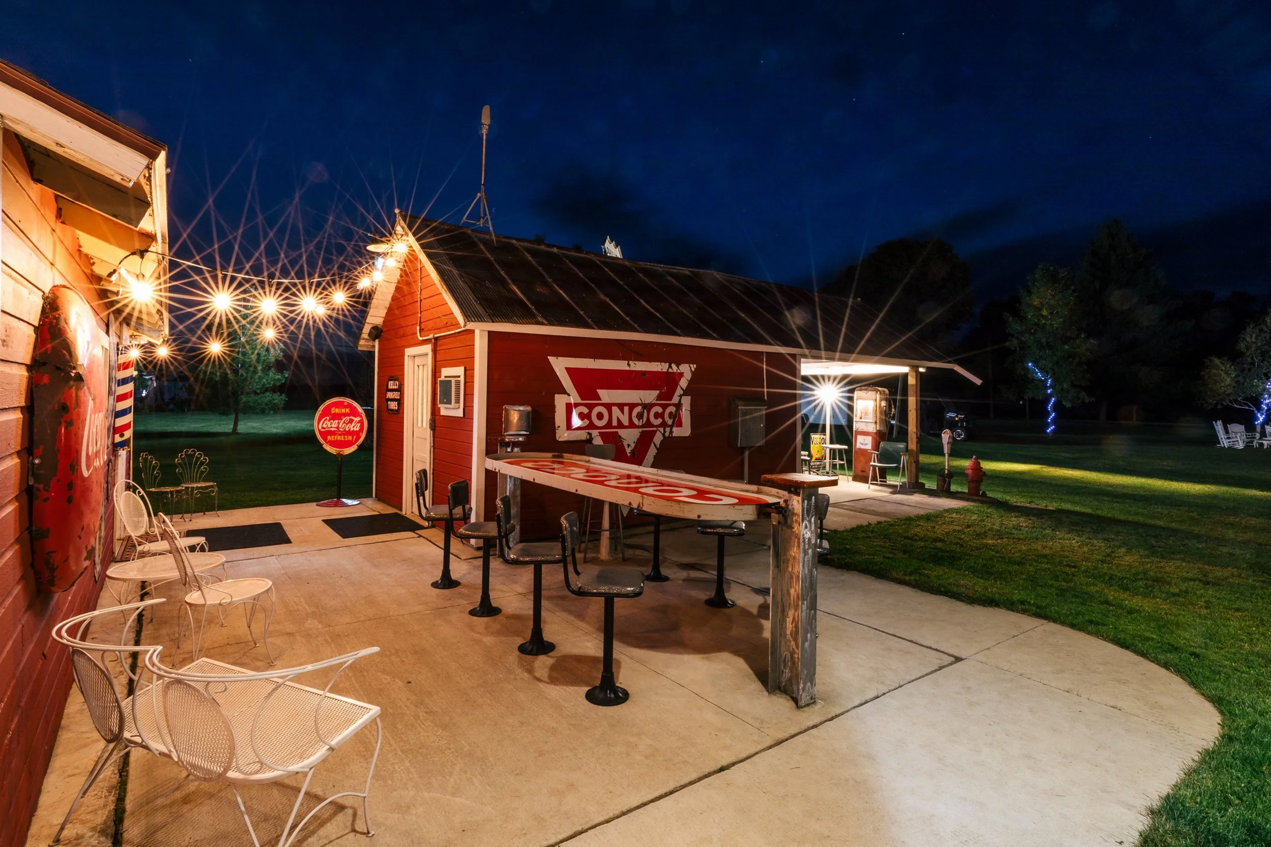 Complete with vintage stools from the 1960s, the Conoco Bar is a one-of-a-kind spot that is typically never empty. Covered with a sun sail for comfort on sunny days , it's the perfect spot for a wedding party lunch on the day of your wedding or event. Guests also enjoy this unique and interesting setting throughout the wedding day, especially after dark when the lights are on. It’s just a short walk across the venue grounds, offering a little quieter space away from the dance floor whenever a breather is needed.